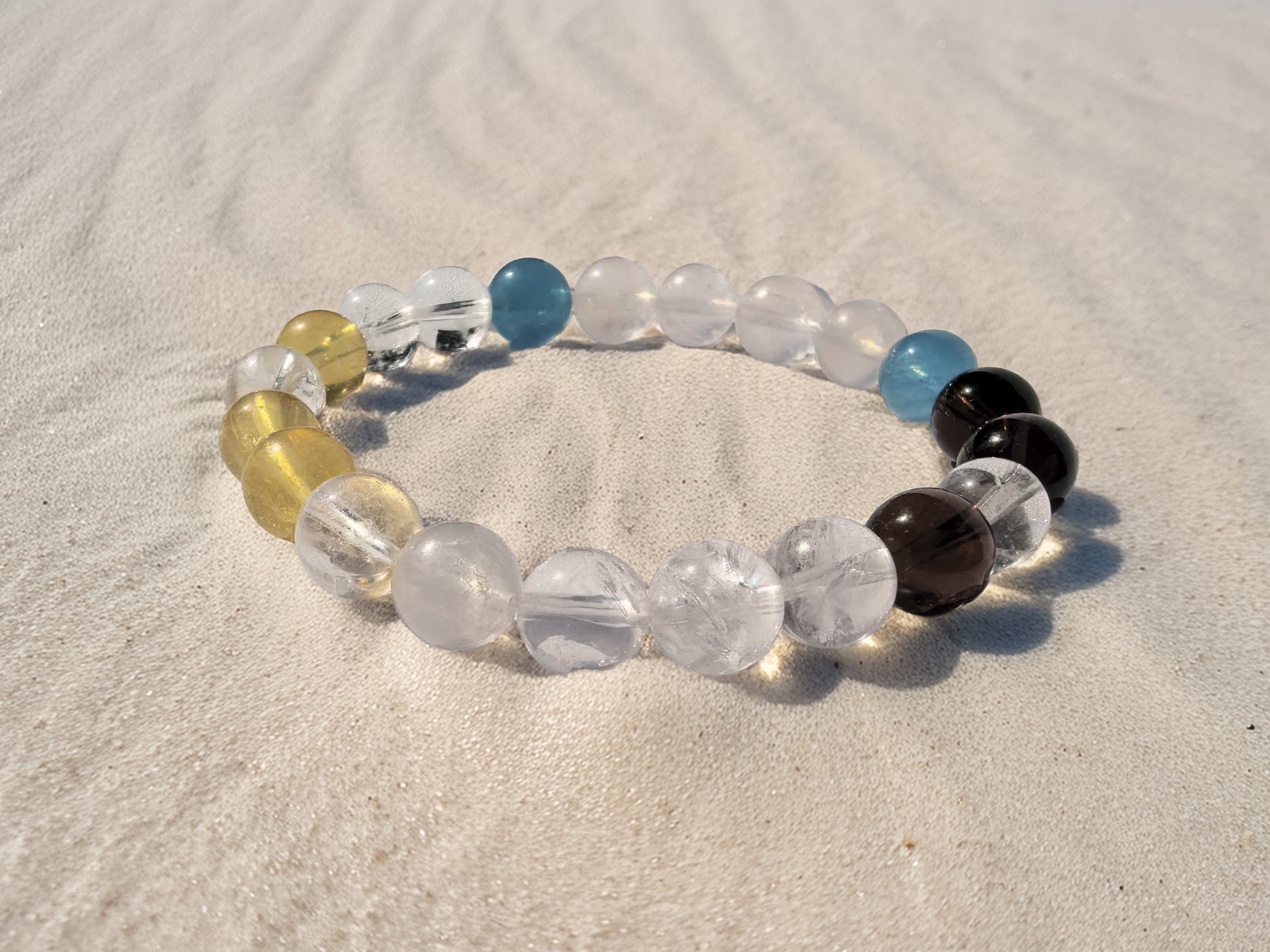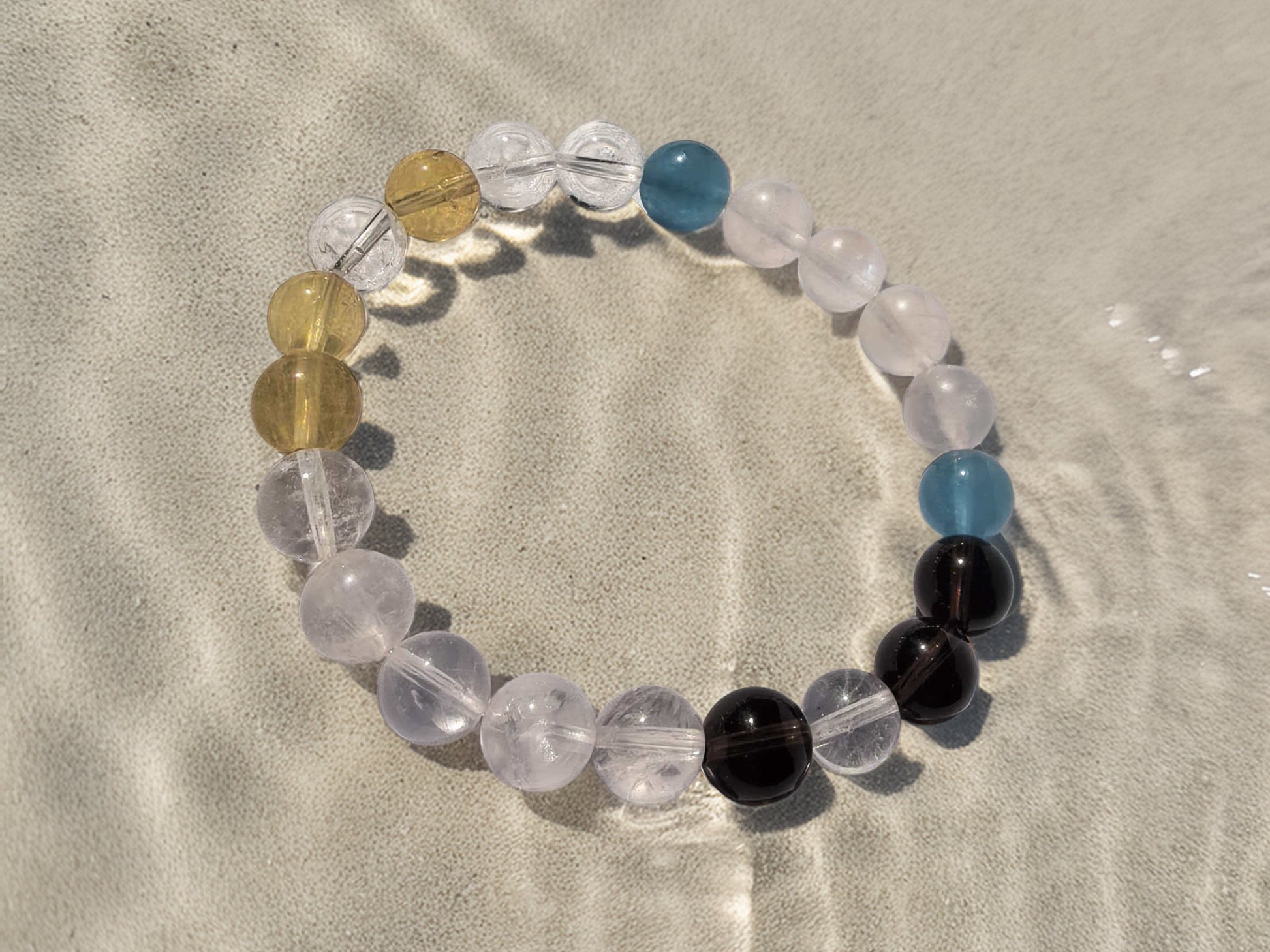 Aquamarine, Rose Moonstone, Himalayan Clear Quartz, Pink Azeztulite, Smoky Quartz, Yellow Fluorite
